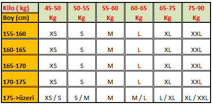 Müşteri siparişleri i le oluşan tahmini beden tablomuz aşağıdaki gibidir ( giyim tarzı ve kullanım şekline göre farklı tercihler olabilir )