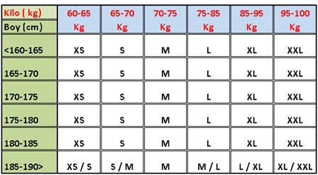 Müşteri siparişleri i le oluşan tahmini beden tablomuz aşağıdaki gibidir ( giyim tarzı ve kullanım şekline göre farklı tercihler olabilir )